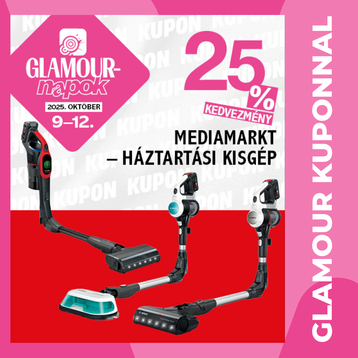 A kedvezmény érvényesítéséhez Glamour kuponfüzet megvásárlása szükséges! A kedvezmény érvényes: október 9-12.25% kedvezmény a megjelölt Bosch Unlimited porszívókra. Kizárólag sérülésmentes, eredeti kupont fogadunk el. Az áruházban való érvényesítéshez fordulj szaktanácsadóinkhoz. 2025. október 9–12. között, legfeljebb a készlet erejéig váltható be a MediaMarkt üzleteiben és webáruházában csak háztartási mennyiség erejéig. A kupon készpénzre nem váltható, egyéb kedvezménnyel nem összevonható és a beváltási időszakban érvényes reklámújságban szereplő termékekre nem érvényes.