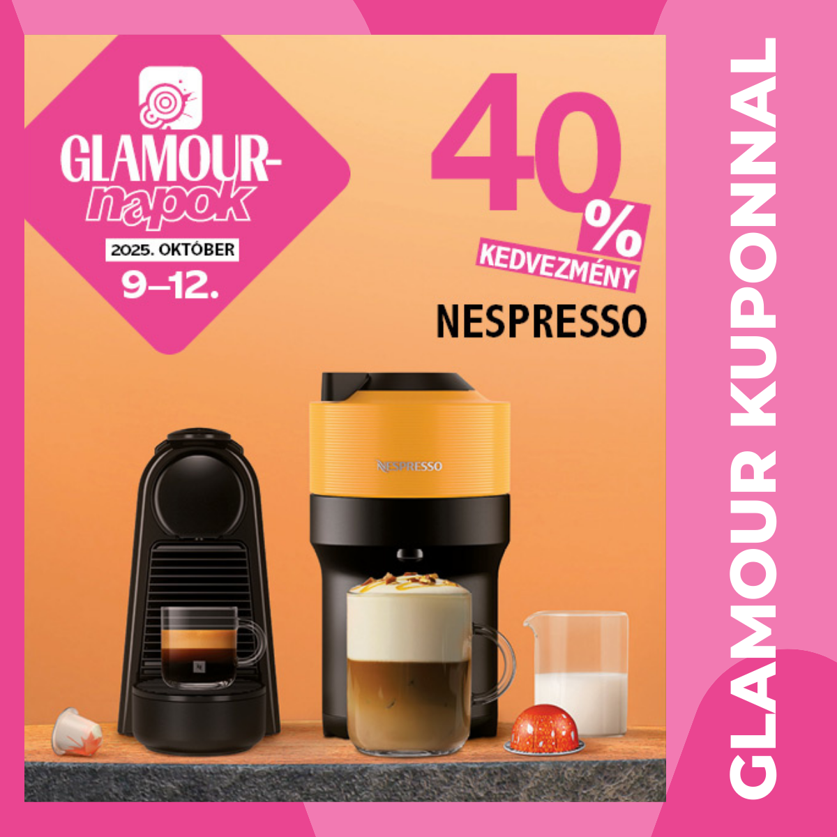 A kedvezmény érvényesítéséhez Glamour kuponfüzet megvásárlása szükséges! 40% kedvezmény bármely Vertuo kávégép és Original Essenza Mini, Pixie, Citiz kávégép árából legalább 100 darab Nespresso kávékapszula egyidejű vásárlása esetén. A promóciós készlet eloszlása és elérhetősége a részt vevő üzletekben nem egyenletes. A kedvezményt kizárólag Nespresso Klubtagsággal rendelkező vásárló veheti igénybe. További részletekért kérjük olvassa el a promóció részleteit a www.nespresso.com/hu/hu oldalon vagy érdeklődjön a Nespresso üzletekben.