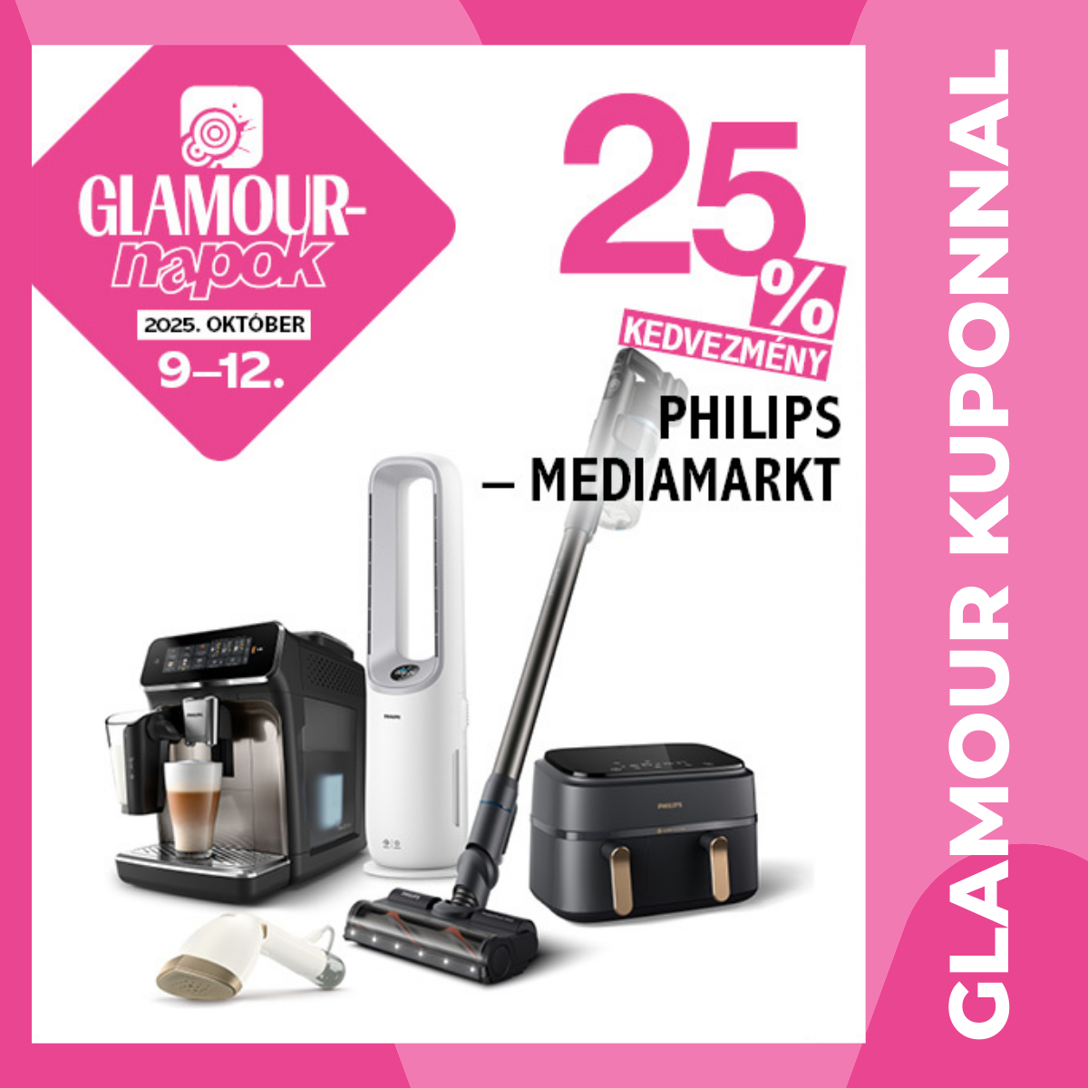 A kedvezmény érvényesítéséhez Glamour kuponfüzet megvásárlása szükséges! 25% kedvezmény a megjelölt Philips háztartási kisgépekre. A kupon más, a termék vételárát csökkentő egyéb kedvezménnyel együtt nem vehető igénybe. A kupon a beváltási időszakban érvényes reklámújságban szereplő termékek vásárlásakor nem váltható be. A kupon készpénzre nem váltható, kizárólag sérülésmentes és eredeti kupont áll módunkban elfogadni, az érvényesítéshez fordulj szaktanácsadóinkhoz.A kupon kizárólag 2025. október 9–12-ig, de legfeljebb a készlet erejéig váltható be valamennyi MediaMarkt áruházban és a webáruházban. Csak háztartásban használatos mennyiségeket szolgálunk ki.