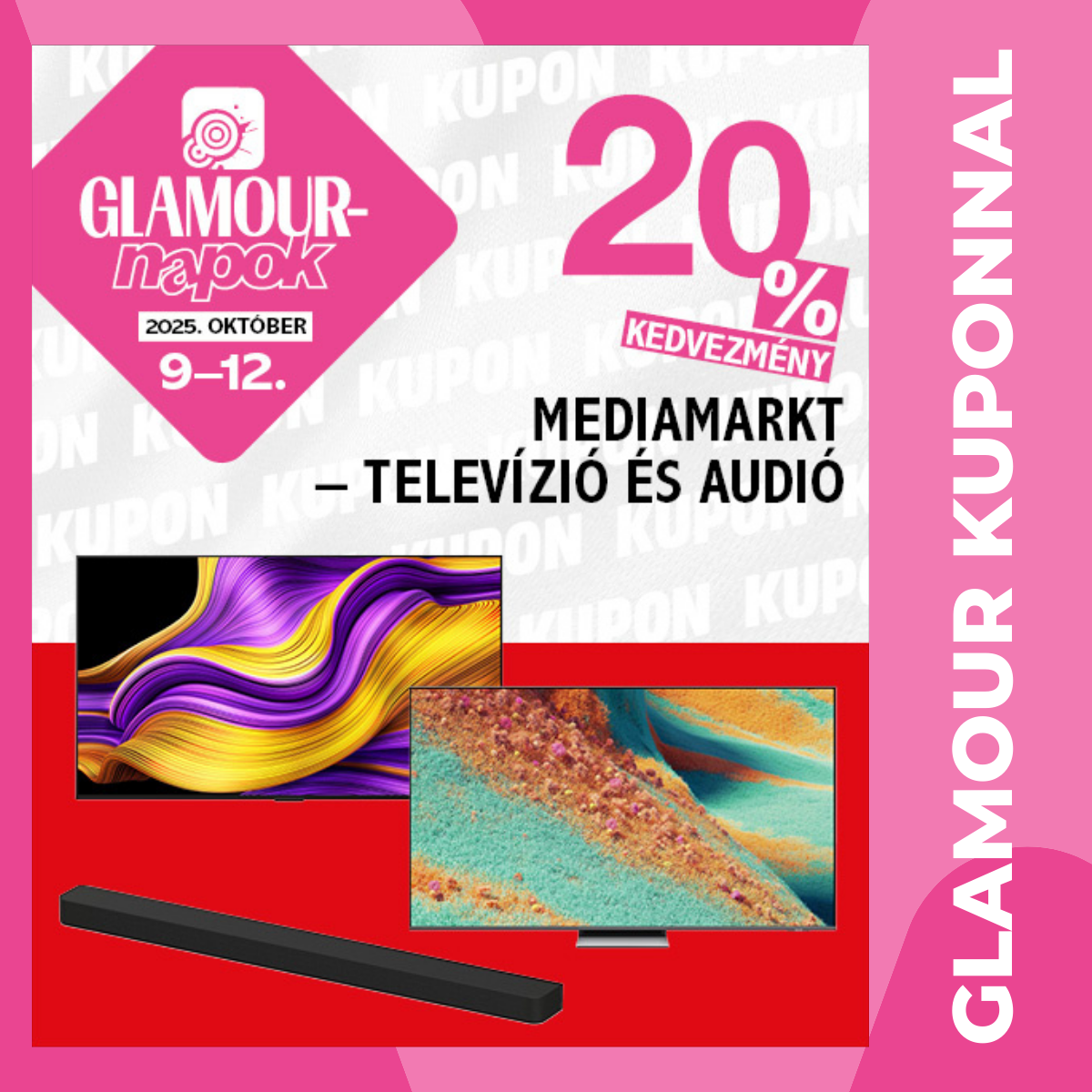 A kedvezmény érvényesítéséhez Glamour kuponfüzet megvásárlása szükséges! 20% kedvezmény a megjelölt televíziókra és audió termékekre. Kizárólag sérülésmentes, eredeti kupont fogadunk el. Az áruházban való érvényesítéshez fordulj szaktanácsadóinkhoz. 2025. október 9–12. között, legfeljebb a készlet erejéig váltható be a MediaMarkt üzleteiben és webáruházában csak háztartási mennyiség erejéig. A kupon készpénzre nem váltható, egyéb kedvezménnyel nem összevonható és a beváltási időszakban érvényes reklámújságban szereplő termékekre nem érvényes.